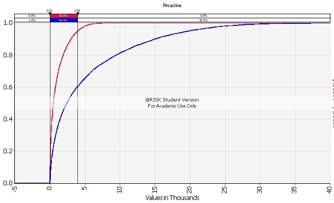 From the table and the graph is shows that probability of infection, given the consumption of contaminated water is 0.258. For the reactive scenario it means that 8,527 people, out of 100,000 people, get infected. In the proactive scenario the number of people is lower, 1,705 people will get infected from drinking the contaminated water.