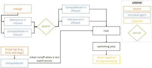 Exposure Scenario Athletes will be exposed to Adenovirus and Campylobacter via direct accidental ingestion while swimming in the river during the triathlon event. Exposure is estimated using data for the consumption of water during swimming and time spent in the water. The dose of pathogens ingested takes into consideration this exposure rate and concentration of pathogens in the river where the athletes are swimming. Figure 2 describe the sources (orange), microbial agents (blue), and barriers (green) that contribute to the final exposure route of direct ingestion (yellow) for each of the scenarios evaluated.