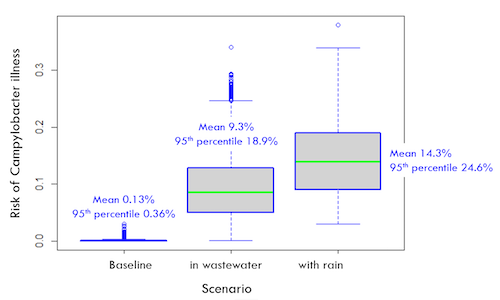 In the second scenario, Campylobacter was considered to be in the background river concentration (baseline scenario) as well as in the wastewater effluent (along with the Adenovirus in the wastewater effluent). Table 2 describes the changes in risk resulting from this inclusion. The mean risk increase significantly from 0.13% to 9.3% and the 95th percentile risk increased from 0.36% to 18.9%.