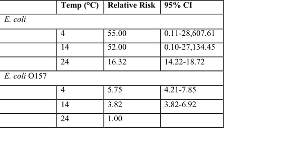 In order to determine if the difference in risk between packaged and unpackaged data are statistically significantly different, a two tailed t-test was performed on the median risk values for each temperature. The null hypothesis for these tests was that the mean of the packaged data and the mean of the unpackaged data are the same. The results from the t-tests (Table 5) showed that the difference in risks varied with the temperature and in some cases the organisms.