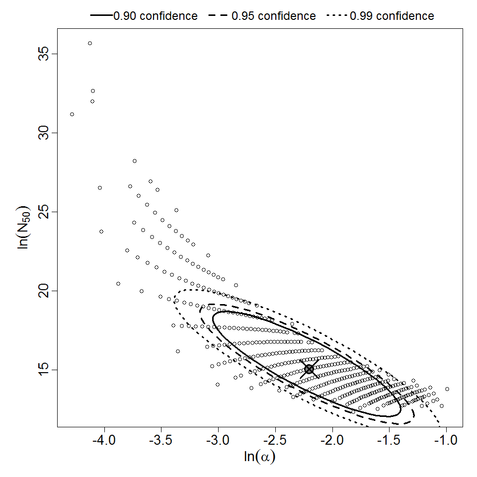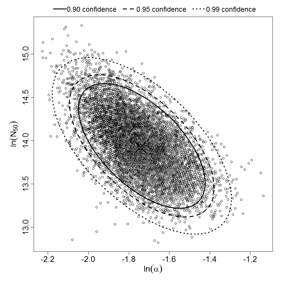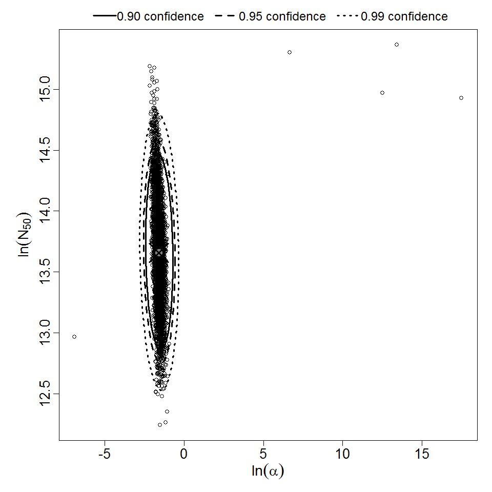 Parameter scatter plot for beta Poisson model ellipses signify the 0.9, 0.95 and 0.99 confidence of the parameters.