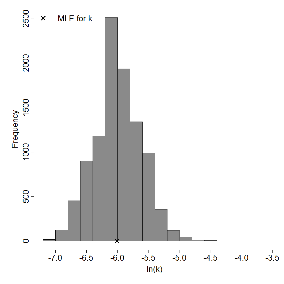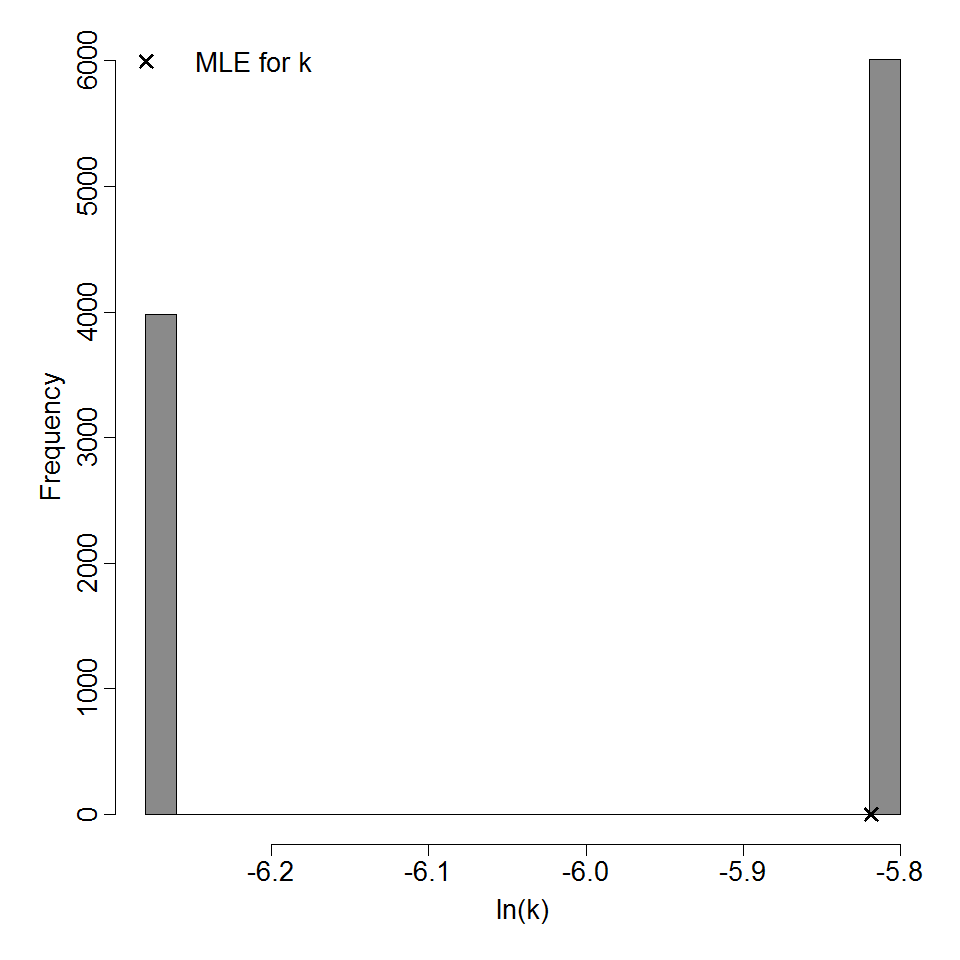 Parameter histogram for exponential model (uncertainty of the parameter)