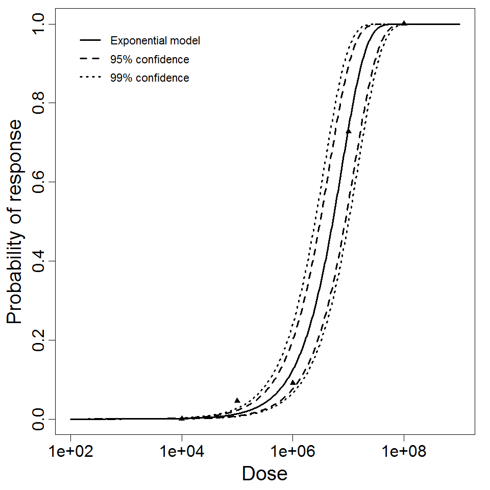 A set of classical dose-response data for F. tularensis infection via oral exposure by Quan et al were used in investigating the effects of inoculation route on the response. Albino mice were infected orally with drinking water contaminated with 104 to 108 organisms of a highly virulent Aa strain.