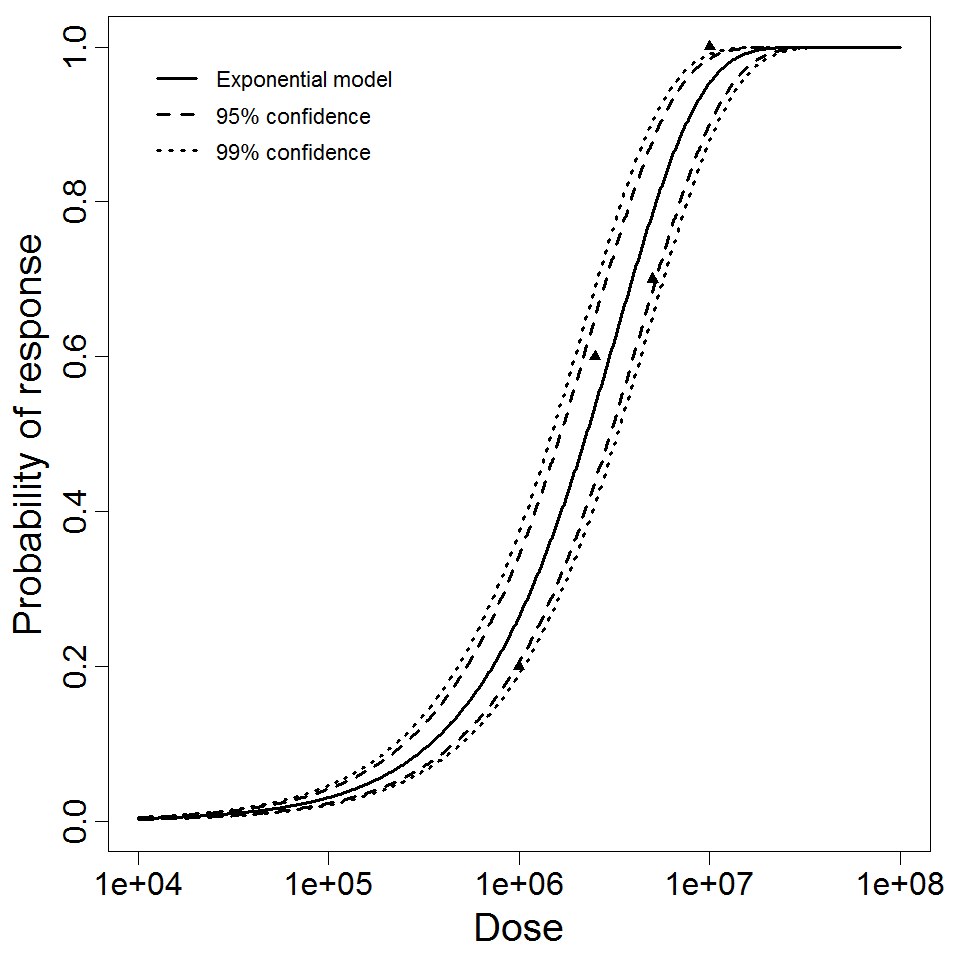 It is recommended that the pooled experiments 253 and 254 should be used as the best dose-response model. Both strains are common in outbreaks. The pooling narrows the range of the confidence region of the parameter estimates and enhances the statistical precision.