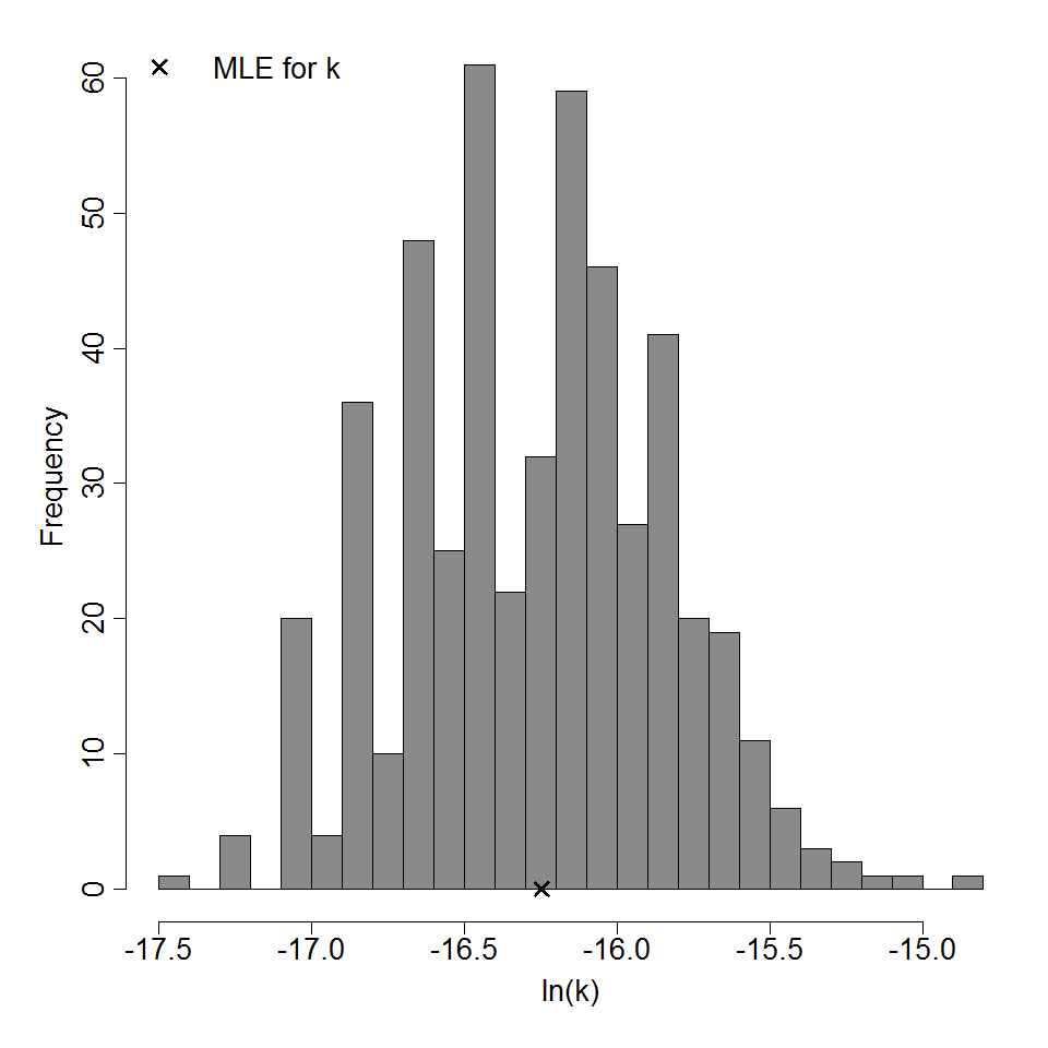 Parameter histogram for exponential model (uncertainty of the parameter)