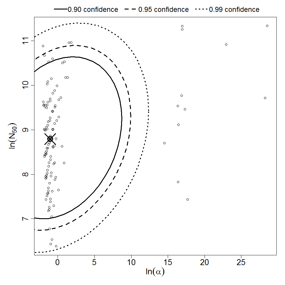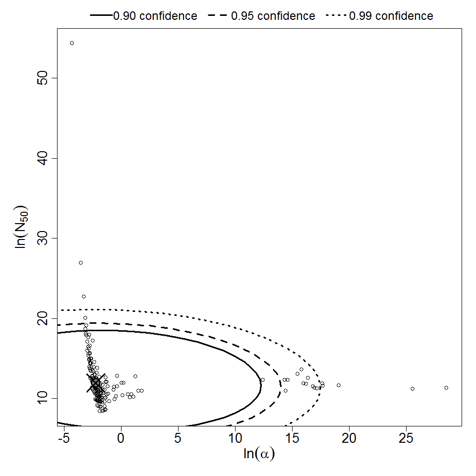 Exponential model plot, with confidence bounds around optimized model