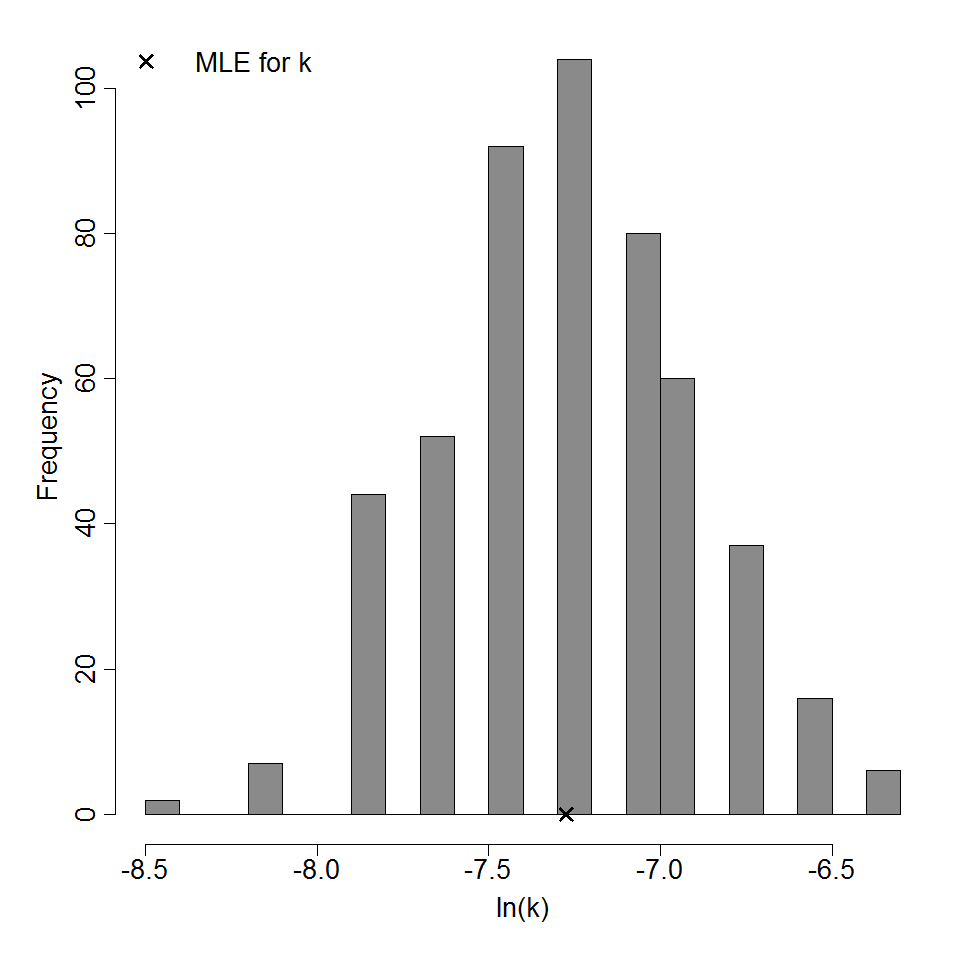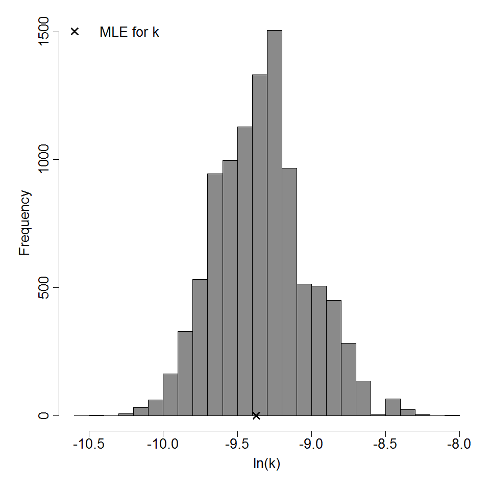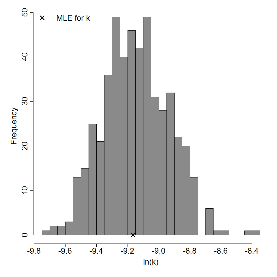 Parameter histogram for exponential model (uncertainty of the parameter)