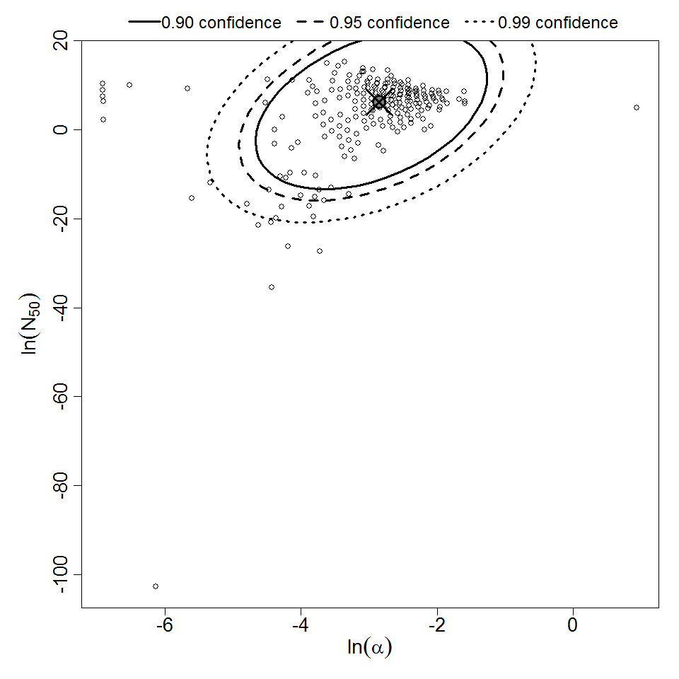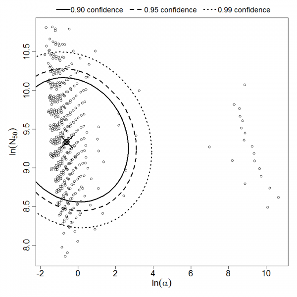 Parameter scatter plot for beta Poisson model ellipses signify the 0.9, 0.95 and 0.99 confidence of the parameters.